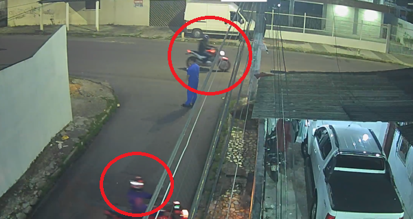 O crime foi filmado por câmeras de segurança e mostram que ainda nem tinha amanhecido quando a dupla aparece em duas motocicletas. Eles agem de forma violenta e rendem a vítima.
