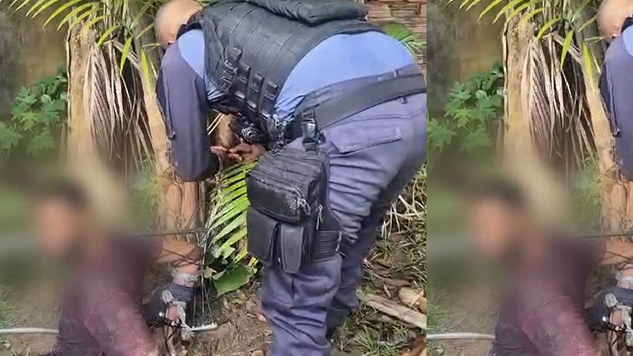 Em um vídeo, é possível ver a vítima com as mãos e pernas amarradas, visivelmente machucada e desorientada. No momento do resgate, ele chega a agradecer, dizendo: “Jesus, obrigada”, enquanto um policial corta os fios que o mantinham amarrado.