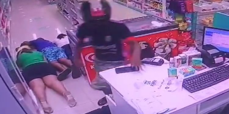 Os bandidos entraram armados, e com medo de morrer, as pessoas deitaram-se no chão. Um dos criminosos ficou do lado de fora. As imagens deixam claro que as vítimas ficaram à mercê dos bandidos.