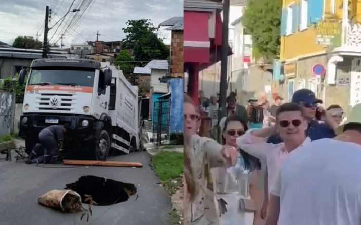 MANAUS (AM) – Choveu praticamente o previsto para um mês inteiro nesta terça-feira (4), com um volume de chuva de 109,9 milímetros, segundo a Defesa Civil, e Manaus já contabiliza vários prejuízos enquanto o prefeito de Manaus, David Almeida (Avante), curte um “retiro espiritual” no Caribe. Na manhã desta quarta-feira (5), depois de tanta água, um caminhão de lixo caiu em uma cratera que se abriu na rua Paraíba, no bairro Coroado, Zona Leste.