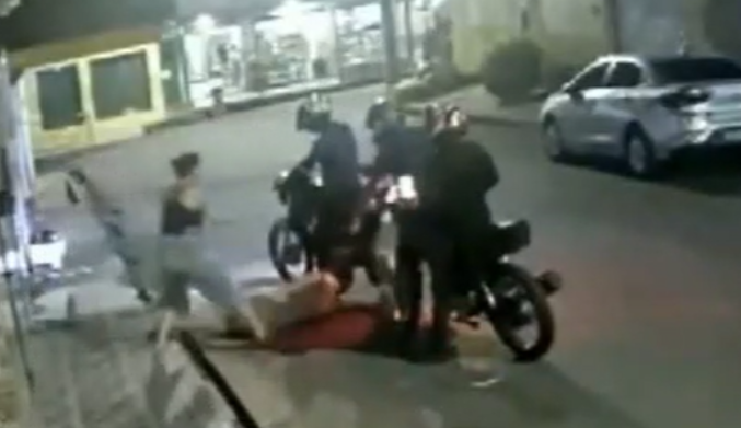 No vídeo, a mulher está acompanhada de outra e mais um homem, que seria marido de uma delas. Eles caminham pela rua quando de repente são abordados por duas motos, uma com dois assaltantes e outra apenas com um.
