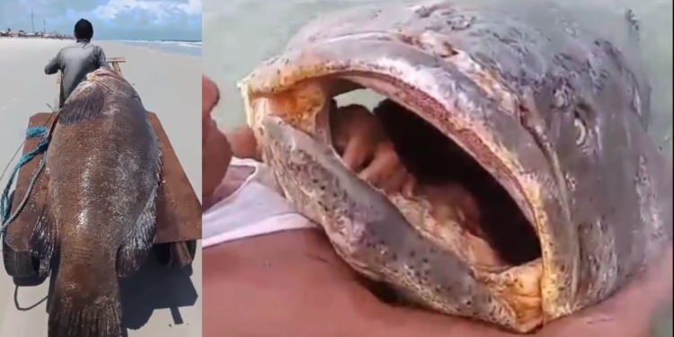 Homem pega peixe gigante na praia de AJURUTEUA, litoral bragantino, nordeste do estado do Pará. O peixe também conhecido como o “Sr. Das Pedras” é um “MERO” e ficou preso na praia quando a maré baixou. 😱👀😱 pic.twitter.com/9k8nftsho6