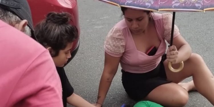 Ela e ele ficaram caídos no asfalto da rua Natal. A jovem tem um ferimento na cabeça. Os dois foram levados para o Joventina Dias, mas ainda não se sabe a extensão das lesões.