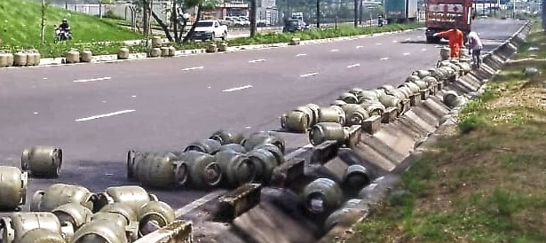A motorista foi encaminhada para uma unidade hospitalar. O caminhão ficou tombado no meio da avenida e os botijões também ficaram na pista.