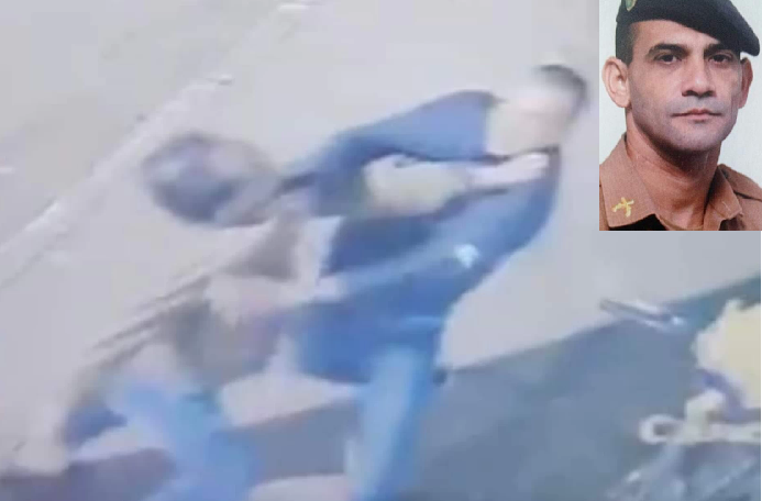 Segundo a Polícia Militar, o policial aparece discutindo com um homem não identificado, do lado de fora. O suspeito aparece ainda com duas sacolas na mão enquanto briga com o sargento.