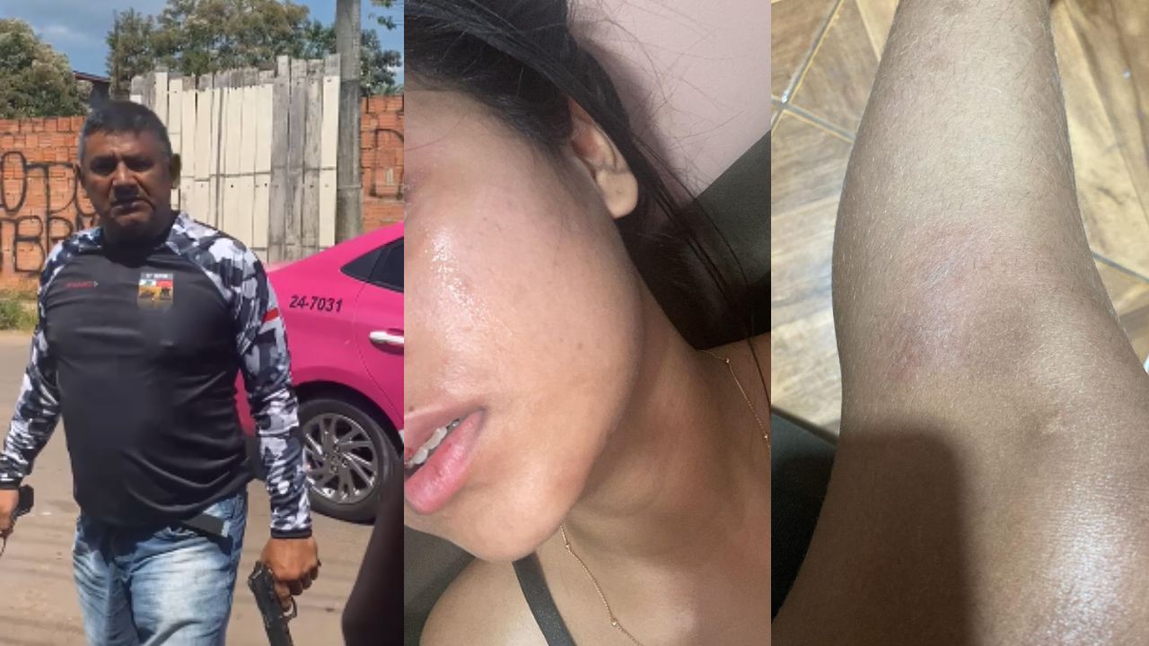 Em um vídeo o homem aparece descendo de uma viatura rosa, da Maria da Penha, e a vítima dizendo: “agrediu minha mãe e me agrediu também”.