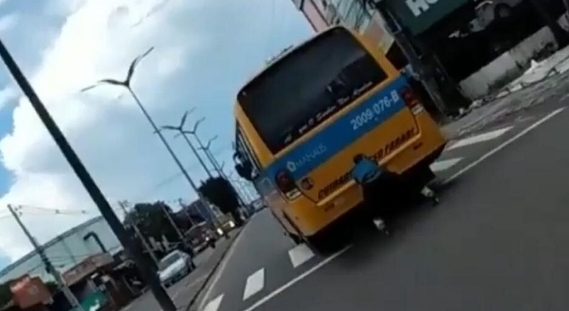 MANAUS–AM| Neste domingo (5), um vídeo de um jovem pegando ‘carona’ em um ônibus se tornou viral. Nas imagens, o jovem que arrisca a própria vida, aparece atrás do veículo na avenida Grande Circular, zona Norte de Manaus.