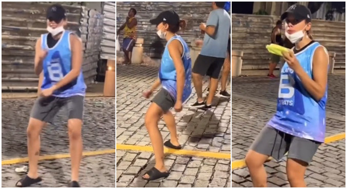 Como o look é totalmente diferente dos que costuma usar, a funkeira passou despercebida. Enquanto alguém grava ela dança muito, enquanto várias pessoas passam por ela e nem imagina que é a Anitta ali no meio do povão.