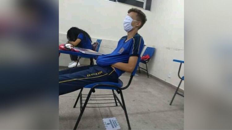 Na sala de aula, o aluno – menor de idade de iniciais J.V – aparece com a máscara cobrindo totalmente seu rosto, enquanto ele parece estar dormindo no meio da aula. Ainda na imagem, é possível ver que pelo menos o distanciamento entre uma carteira e outra foi respeitada.