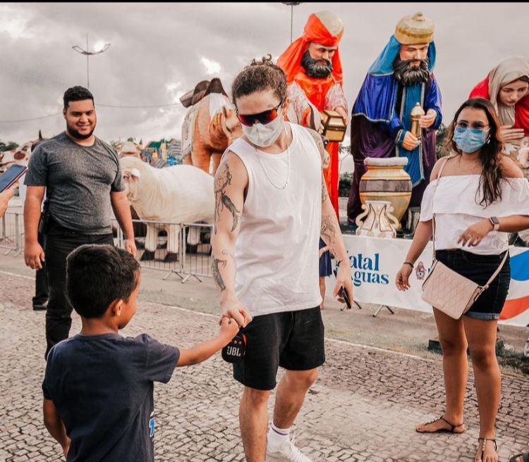 Whindersson que fará um show na capital amazonense, neste sábado, 11/12, pousou ao lado de uma criança e outros fãs. No passeio pela Ponta Negra, ele aproveitou para admirar a ornamentação natalina que possui vários espaços instagramáveis, como a fonte e o “Ballet das Águas”, e a árvore de natal com 40 metros de altura. No carrossel de fotos, também tinham imagens dele na Arena da Amazônia, local de sua apresentação.