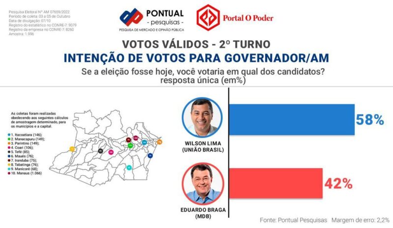 Conforme informado pelo Portal O Poder, o Instituto Pontual Pesquisas divulga o primeiro levantamento para o segundo turno das eleições do Amazonas nesta sexta-feira, 7.