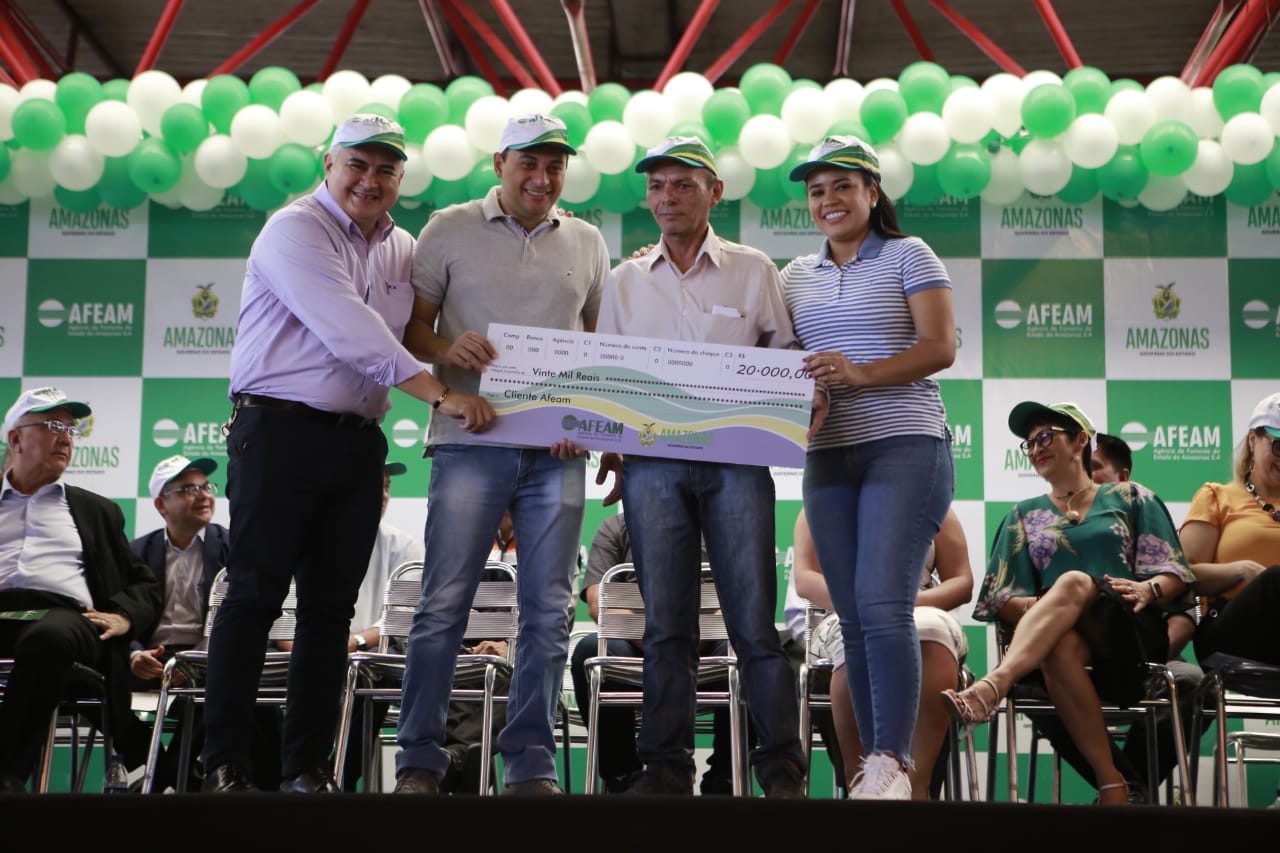 Na oportunidade, clientes novos e especiais da Afeam receberam cheques simbólicos nos valores de R$ 10, R$ 15 e R$ 20 mil das mãos do governador Wilson Lima, da primeira-dama Taiana Lima, e do diretor-presidente da Afeam, Marcos Vinicius Castro.