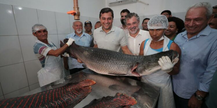 Manaus – O governador Wilson Lima participou, nesta segunda-feira (04/11), da inauguração de iniciativas para o fortalecimento da cadeia produtiva de manejo do pirarucu na Reserva de Desenvolvimento Sustentável (RDS) Mamirauá, em Fonte Boa (a 678 quilômetros de Manaus). A unidade de beneficiamento, o entreposto de pescado e o complexo frigorífico inaugurados receberam recursos do Fundo Amazônia e vão beneficiar mais de 500 famílias. No município, o governador também anunciou a retomada de obras em escolas estaduais.