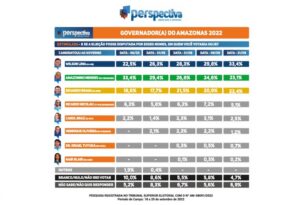Nova pesquisa eleitoral da Perspectiva, quinta do ano para a corrida ao governo do Amazonas mostra que Wilson Lima (União Brasil) se consolida no caminho da reeleição. No resultado de estudo publicado hoje, a 11 dias do primeiro turno, o governador aparece com 33,4% das intenções de votos, dobrando sua vantagem para Amazonino Mendes.