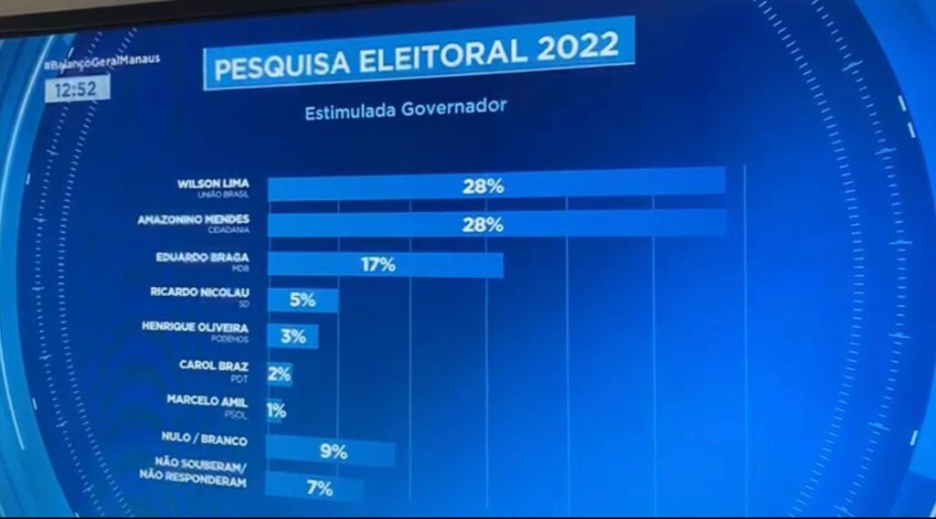 MANAUS – AM | Uma pesquisa feita pela Real Time Big Data para a Record TV mostra que o governador Wilson Lima (União Brasil) e o ex-governador Amazonino Mendes (Cidadania) continuam empatados na corrida pelo governo do Amazonas.
