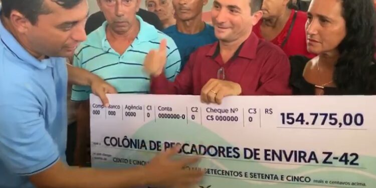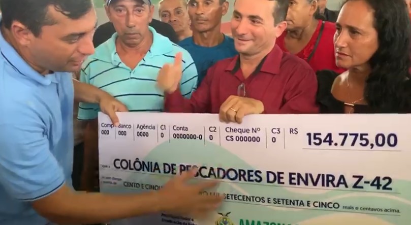 Envira- AM| O governador do Amazonas, Wilson Lima, entregou, nesta quarta-feira (29/01), um cheque simbólico no valor de R$ 154.775,00 para a Colônia de Pescadores de Envira Z-42. Os recursos, viabilizados por meio do Fundo de Promoção Social e Erradicação da Pobreza (FPS), serão revertidos na aquisição de implementos e equipamentos agrícolas para a associação do município da calha do Juruá, distante 1.208 quilômetros da capital.