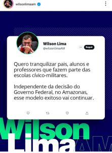 Em seu Twitter pessoal na tarde desta quinta-feira (13), ele disse que o estado do Amazonas irá manter o programa educacional que era executado em parceria entre o MEC e o Ministério da Defesa, independente da decisão da Governo Federal.