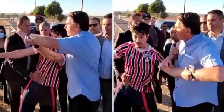 Bolsonaro a entrar no carro oficial para seguir para sua agenda, mas, com a aumento dos xingamentos, acabou saindo do veículo e foi em direção a Leão. O presidente disse que queria falar com o youtuber e tentou pegar o celular dele, mas acabou puxando o homem pela gola da blusa, depois no braço dele.