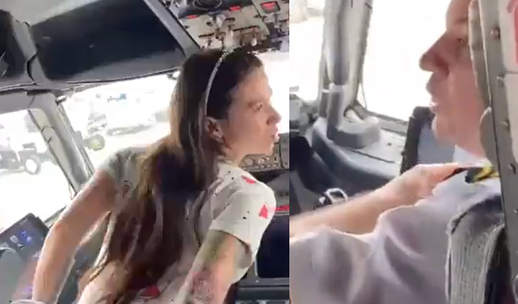 Ela está na cadeira do piloto e assim que abaixa a calça para uma foto, é advertida pelo profissional que diz que não é permitido aquele tipo de atitude por questões éticas de segurança.